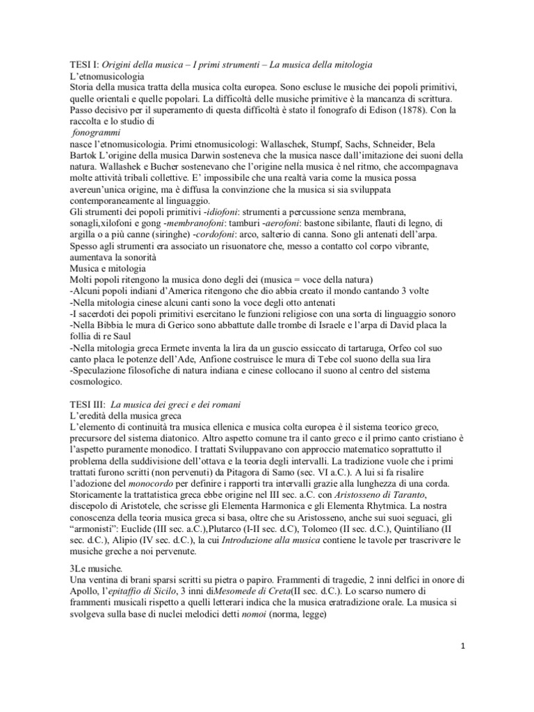 TESI I: Origini della musica I primi strumenti La musica della mitologia Letnomusicologia Storia della musica tratta della