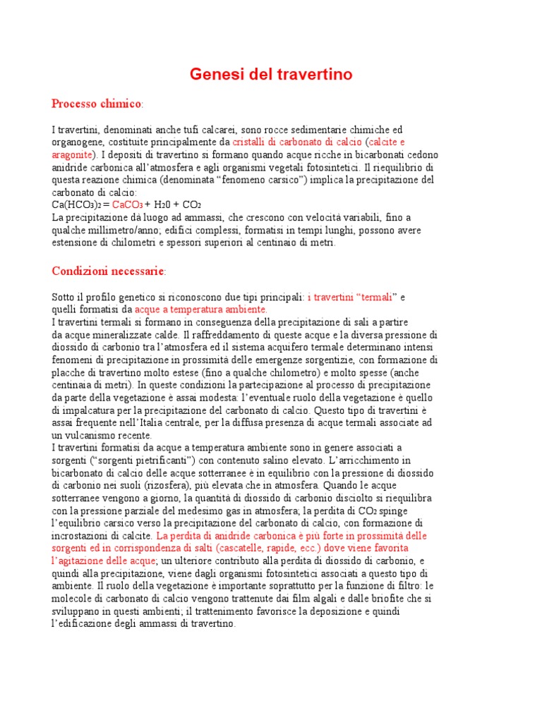 I travertini, denominati anche tufi calcarei, sono rocce sedimentarie chimiche ed organogene, costituite principalmente da cristalli di carbonato di calcio (calcite e aragonite). I depositi di travertino si formano quando acque ricche in bicarbonati cedono anidride carbonica allatmosfera e agli organismi vegetali fotosintetici. Il riequilibrio di questa reazione chimica (denominata fenomeno carsico) implica la precipitazione del carbonato di calcio: Ca(HCO3)2 = CaCO3 + H20 + CO2 La precipitazione d luogo ad ammassi, che crescono con velocit variabili, fino a qualche millimetro/anno; edifici complessi, formatisi in tempi lunghi, possono avere estensione di chilometri e spessori superiori al centinaio di metri.
