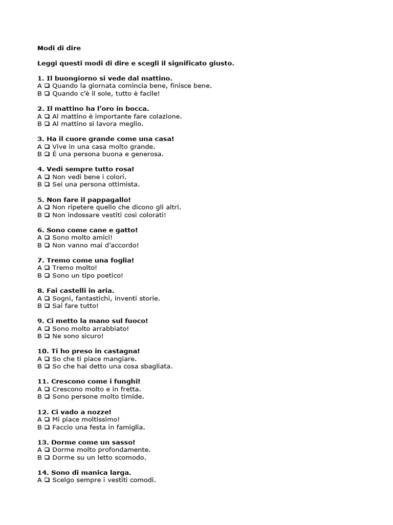Leggi questi modi di dire e scegli il significato giusto.