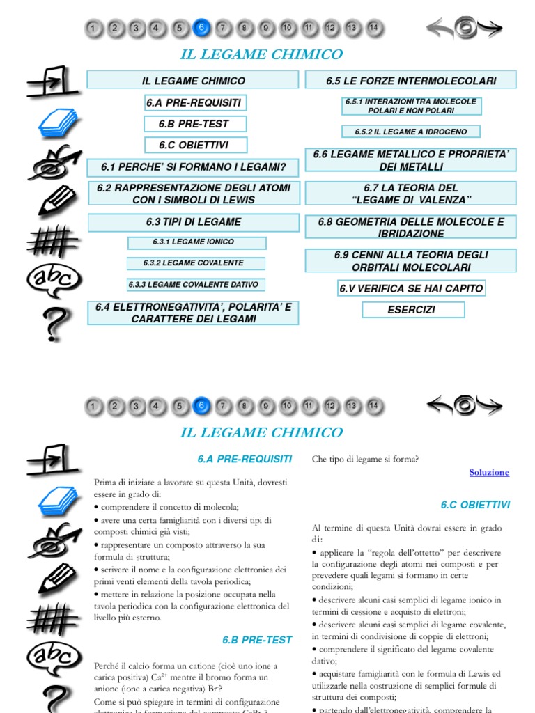 IL LEGAME CHIMICO 6.A PRE-REQUISITI 6.B PRE-TEST 6.C OBIETTIVI 6.1 PERCHE SI FORMANO I LEGAMI? 6.2 RAPPRESENTAZIONE DEGLI ATOMI CON I SIMBOLI DI LEWIS 6.3 TIPI DI LEGAME