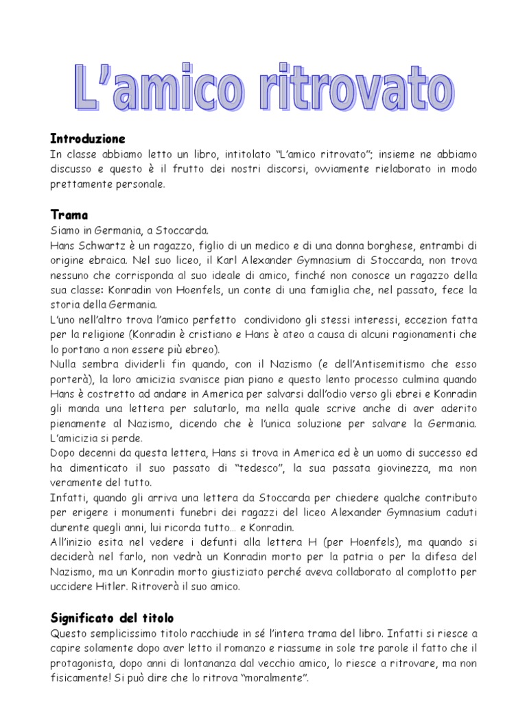 In classe abbiamo letto un libro, intitolato Lamico ritrovato; insieme ne abbiamo discusso e questo il frutto dei nostri discorsi, ovviamente rielaborato in modo prettamente personale.