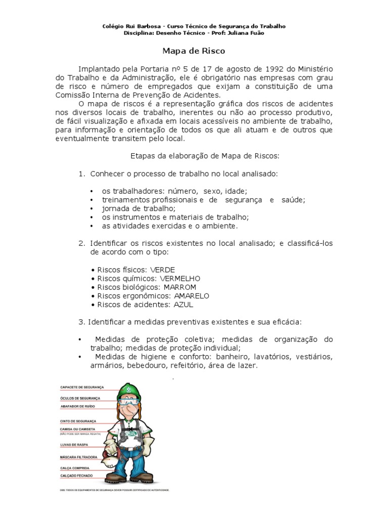 Implantado pela Portaria nº 5 de 17 de agosto de 1992 do Ministério do Trabalho e da Administração, ele é obrigatório nas empresas com grau de risco e número de empregados que exijam a constituição de uma Comissão Interna de Prevenção de Acidentes. O mapa de riscos é a representação gráfica dos riscos de acidentes nos diversos locais de trabalho, inerentes ou não ao processo produtivo, de fácil visualização e afixada em locais acessíveis no ambiente de trabalho, para informação e orientação de todos os que ali atuam e de outros que eventualmente transitem pelo local.