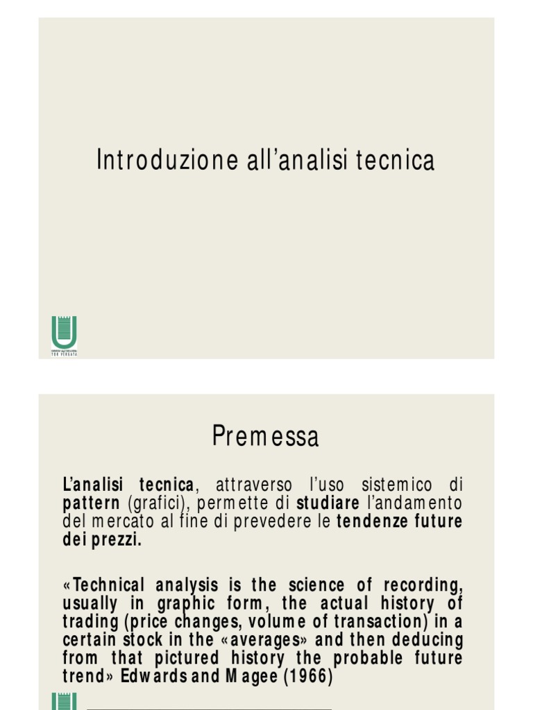 Lanalisi tecnica, attraverso luso sistemico di pattern (grafici), permette di studiare landamento del mercato al fine di prevedere le tendenze future dei prezzi. Technical analysis is the science of recording, usually in graphic form, the actual history of trading (price changes, volume of transaction) in a certain stock in the averages and then deducing from that pictured history the probable future trend Edwards and Magee (1966)