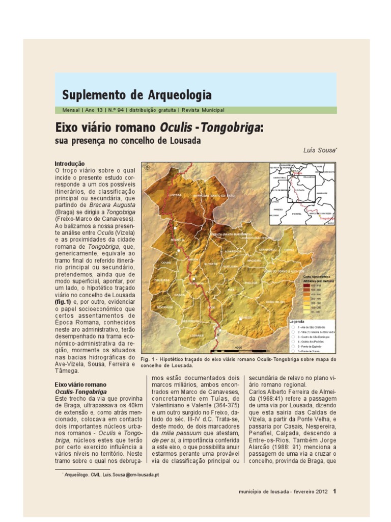 romana de Tongobriga, que, genericamente, equivale ao tramo final do referido itinerá- rio principal ou secundário, pretendemos, ainda que de modo superficial, apontar, por um lado, o hipotético traçado viário no concelho de Lousada