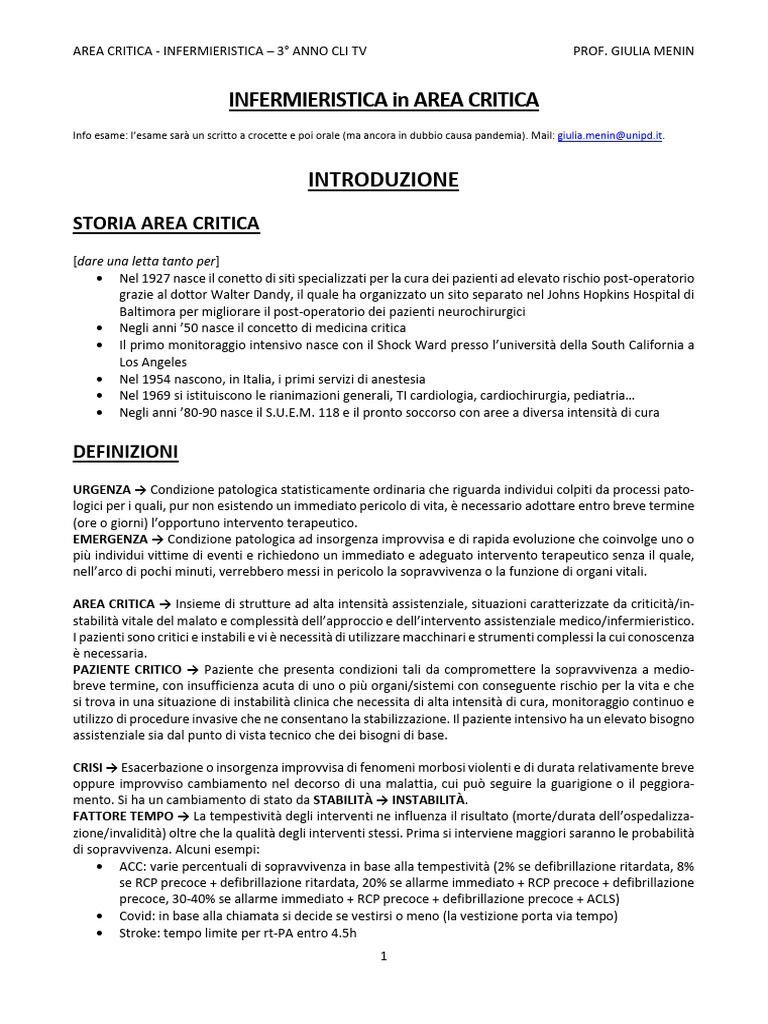 AREA CRITICA - INFERMIERISTICA – 3° ANNO CLI TV PROF. GIULIA MENIN