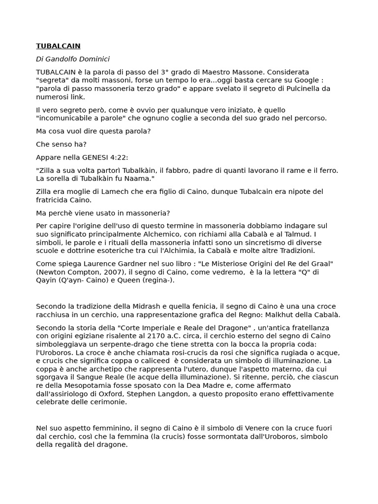 TUBALCAIN è la parola di passo del 3° grado di Maestro Massone. Considerata