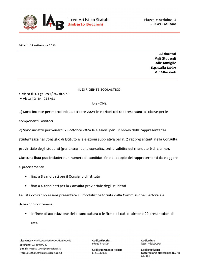 1) Sono indette per mercoledì 23 ottobre 2024 le elezioni dei rappresentanti di classe per le