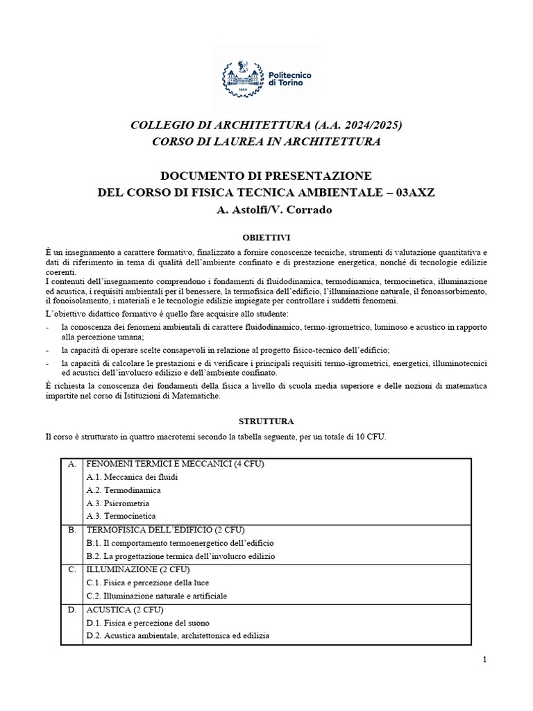 Collegio di Architettura – Corso di laurea in Architettura – Fisica Tecnica Ambientale (03AXZ)