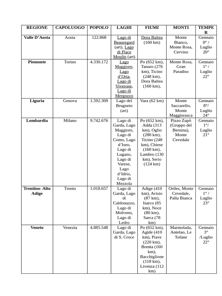 REGIONE CAPOLUOGO POPOLO LAGHI FIUMI MONTI TEMPE