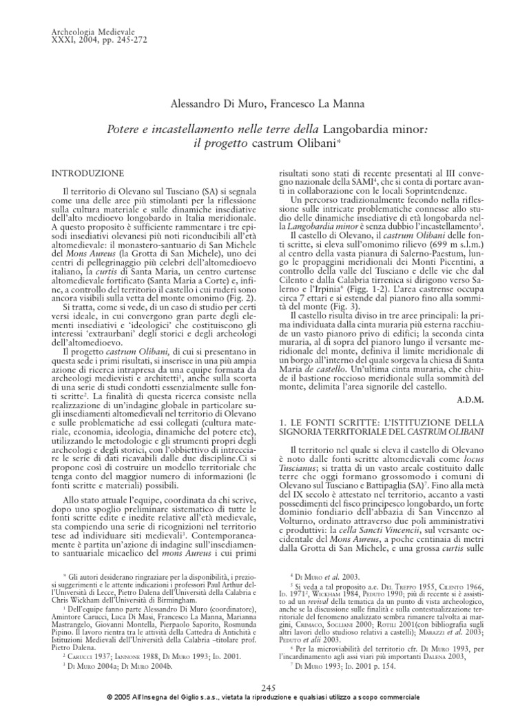 Chronicon Salernitanum, A critical edition with studies on literary and historical sources and on language, a cura di U. Westerberg, AUS, Studia latina Stockholmensia, Stockholm 1956. CILENTO N., 1966, Le origini della signoria capuana nella Longobardia minore, Roma, Istituto Storico Italiano per il Medio Evo. CILENTO N., 1971, Italia meridionale longobarda, Milano-Napoli. CITTER C., VELLUTI G., 1993, Il Frantoio di Rocca San Silvestro (Campiglia M.-LI): appunti per la ricostruzione del ciclo dellolio doliva, Archeologia Medievale, XX, pp. 151-184. CORDELLA F., 1998, A guardia del territorio. Castelli e opere fortificate della valle del Sarno, Napoli. CRIMACO L., SOGLIANI F., 2000, Indagini preliminari sullinsediamento fortificato di monte petrino (Mondragone- CE), in II Congresso nazionale di archeologia medievale (Brescia, settembre-ottobre 2000), Firenze, pp. 199-208. DALENA P., 2003, Dagli Itinera ai percorsi. Viaggiare nel Mezzogiorno medievale, Bari. DEL TREPPO M.,1956, La vita economica e sociale in una grande abbazia del Mezzogiorno: S. Vincenzo al Volturno nellalto medioevo, Archivio Storico per le Province Napoletane LXXIV, pp. 31-111. DI MURO A., 1993, Organizzazione territoriale e modi della produzione nellAltomedioevo meridionale. Il caso del locus Tuscianus, Apollo, IX, pp. 60-107. DI MURO A., 1996, La cultura artistica nella Langobardia minor nellVIII secolo e la decorazione pavimentale e parietale della cappella palatina di Arechi II a Salerno, Napoli. DI MURO A., 1998, Due citt capitali: Salerno e Mileto, in Scavi medievali in Italia 1994-1995, Prima conferenza di Archeologia Medievale in Italia (Cassino, 1995), a cura di S. Patitucci Uggeri, Roma, pp. 61-69. DI MURO A., 2000, Le terre del medio e basso corso del Sele in et longobarda: istituzioni, insediamenti e economia, Rassegna Storica Salernitana, 33, XVII, 1, pp. 4-85. DI MURO A., 2001, Le terre tra Salerno e il Sele in et longobarda, Salerno DI MURO A., 2004a, Villaggi medievali abbandonati nel territorio di Olevano sul Tusciano: il caso di Caprarizzo, Rassegna Storica Salernitana, 41, XXI, pp. 7-21. DI MURO A., 2004b, Il castello, la curtis e il santuario: trasformazioni del paesaggio e dinamiche del potere tra tarda Antichit e alto Medioevo nel territorio di Olevano sul Tusciano, in Paesaggi e insediamenti rurali in Italia meridionale tra Tardoantico e Altomedioevo, c.s. DI MURO et al. 2003 = DI MURO A., LA MANNA F., MASTRANGELO M., SAPORITO.P., WHITEHOUSE D.B., Luce dalla Grotta. Primi risultati delle indagini archeologiche presso il santuario di San Michele ad Olevano sul Tusciano, in III Congresso nazionale di Archeologia medievale (Salerno, ottobre 2003), Firenze, pp. 397-413. FALCO G., 1955, LItalia e la restaurazione delle potest universali, in I problemi comuni dellEuropa post-carolingia, Settimane del CISAM, II, Spoleto, pp. 52-65. VON FALKENHAUSEN V., 1983, I Longobardi meridionali, in Il Mezzogiorno dai Bizantini a Federico II, Storia dItalia UTET III, a cura di G. Galasso, Torino, pp. 249-364. FRANCOVICH R., GINATEMPO M. (a cura di), 2000, Castelli. Storia e archeologia del potere nella Toscana medievale, Firenze. F RANCOVICH R., H ODGES R., 2003, Villa to Village. The transformation of the roman countryside in Italy, c. 4001000, London. FUMAGALLI V., 1976, Terra e societ nellItalia padana. I secoli IX e X, Torino. IANNONE E., 1988, Olevano (Ricerche storiche e documenti), Bellizzi. MANNONI T., GIANNICHEDDA E., 1996, Archeologia della Produzione, Torino.