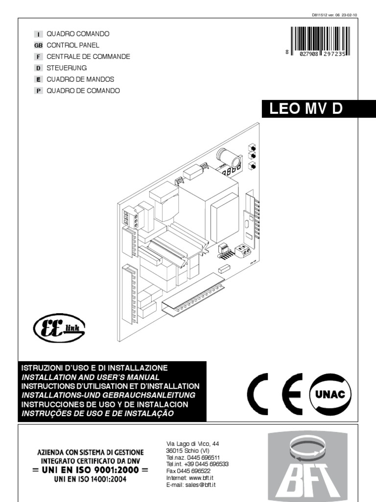 1) GENERAL SAFETY WARNING! An incorrect installation or improper use of the product can cause damage to persons, animals or things. The Warnings leaflet and Instruction booklet supplied with this product should be read carefully as they provide important information about safety, installation, use and maintenance. Scrap packing materials (plastic, cardboard, polystyrene etc) according to the provisions set out by current standards. Keep nylon or polystyrene bags out of childrens reach. Keep the instructions together with the technical brochure for future reference. This product was exclusively designed and manufactured for the use specified in the present documentation. Any other use not specified in this documentation could damage the product and be dangerous. The Company declines all responsibility for any consequences resulting from improper use of the product, or use which is different from that expected and specified in the present documentation. Do not install the product in explosive atmosphere. The construction components of this product must comply with the following European Directives: 2004/108/CEE, 2006/95/EEC, 2006/42/ EEC and subsequent amendments. As for all non-EEC countries, the above-mentioned standards as well as the current national standards should be respected in order to achieve a good safety level. The Company declines all responsibility for any consequences resulting from failure to observe Good Technical Practice when constructing closing structures (door, gates etc.), as well as from any deformation which might occur during use. The installation must comply with the provisions set out by the following European Directives: 2004/108/CEE, 2006/95/EEC, 2006/42/EEC and subsequent amendments. Disconnect the electrical power supply before carrying out any work on the installation. Also disconnect any buffer batteries, if fitted. Fit an omnipolar or magnetothermal switch on the mains power supply, having a contact opening distance equal to or greater than 3,5 mm. Check that a differential switch with a 0.03A threshold is fitted just before the power supply mains. Check that earthing is carried out correctly: connect all metal parts for closure (doors, gates etc.) and all system components provided with an earth terminal. Fit all the safety devices (photocells, electric edges etc.) which are needed to protect the area from any danger caused by squashing, conveying and shearing. Position at least one luminous signal indication device (blinker) where it can be easily seen, and fix a Warning sign to the structure. The Company declines all responsibility with respect to the automation safety and correct operation when other manufacturers components are used. Only use original parts for any maintenance or repair operation. Do not modify the automation components, unless explicitly authorised by the company. Instruct the product user about the control systems provided and the manual opening operation in case of emergency. Do not allow persons or children to remain in the automation operation area. Keep radio control or other control devices out of childrens reach, in order to avoid unintentional automation activation. The user must avoid any attempt to carry out work or repair on the automation system, and always request the assistance of qualified personnel. Anything which is not expressly provided for in the present instructions, is not allowed. Installation must be carried out using the safety devices and controls prescribed by the EN 12978 Standard. 2) GENERAL OUTLINE The LEO MV D control panel is supplied by the manufacturer with standard setting. Any alteration must be set by means of the incorporated display programmer or by means of universal palmtop programmer. The Control unit completely supports the EELINK protocol. It is available in two versions: one for external installation, inside the SD box, the other fitted and pre-wired inside the controller. Its main characteristics are: