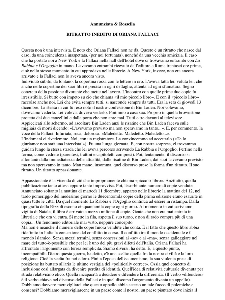 Questa non una intervista. noto che Oriana Fallaci non ne d. Questo un ritratto che nasce dal caso, da una coincidenza inaspettata, (per noi fortunata), nonch da una vecchia amicizia. Il caso che ha portato noi a New York e la Fallaci nella hall dell'hotel dove ci trovavamo entrambi con La Rabbia e l'Orgoglio in mano. L'avevamo entrambi ricevuto dall'editore a Roma trentasei ore prima, cio nello stesso momento in cui approdava nelle librerie. A New York, invece, non era ancora arrivato e la Fallaci non lo aveva ancora visto. Individu subito, da lontano, la copertina rossa con le lettere in oro. L'aveva fatta lei, voluta lei, che anche nelle copertine dei suoi libri precisa in ogni dettaglio, attenta ad ogni sfumatura. Segno concreto della passione divorante che mette nel lavoro. L'incontro con quelle prime due copie fu irresistibile. Si butt con impeto su ci che chiama il mio piccolo libro. E con il piccolo libro raccolse anche noi. Lei che evita sempre tutti, si nasconde sempre da tutti. Era la sera di gioved 13 dicembre. La stessa in cui fu reso noto il nastro-confessione di Bin Laden. Noi volevamo, dovevamo vederlo. Lei voleva, doveva vederlo. Finimmo a casa sua. Proprio in quella brownstone protetta dai due cancellini e dalla porta che non apre mai. Tutti e tre davanti al televisore. Appiccicati allo schermo, ad ascoltare Bin Laden anzi le risatine che Bin Laden faceva sulle migliaia di morti dicendo: L'avevamo previsto ma non speravamo in tanto.... E, per commento, la voce della Fallaci. Infuriata, roca, dolorosa. Maledetto. Maledetto. Maledetto.... L'indomani ci rivedemmo. Noi, con un registratore. La convincemmo ad accettarlo (Te lo giuriamo: non sar una intervista!). Fu una lunga giornata. E, con nostra sorpresa, ci trovammo guidati lungo la stessa strada che lei aveva percorso scrivendo La Rabbia e l'Orgoglio. Perfino nella forma, come vedrete (parentesi, trattini e capitoletti compresi). Poi, lentamente, il discorso si allontan dalla immediatezza delle attualit, dalle risatine di Bin Laden, dai suoi l'avevamo previsto ma non speravamo in tanto. Man mano, insomma, quel discorso prese la forma d'un ritratto. Il suo ritratto. Un ritratto appassionante. Appassionante la vicenda di ci che impropriamente chiama piccolo-libro. Anzitutto, quella pubblicazione tanto attesa eppure tanto improvvisa. Poi, l'esorbitante numero di copie vendute. Annunciato soltanto la mattina di marted 11 dicembre, apparso nelle librerie la mattina del 12, nel tardo pomeriggio del medesimo giorno le duecentomila copie della prima edizione erano esaurite in quasi tutte le citt. Da quel momento La Rabbia e l'Orgoglio continua ad essere in ristampa. Dalla tipografia della Rizzoli escono cinquantamila copie ogni giorno. Al momento in cui scriviamo, vigilia di Natale, il libro arrivato a mezzo milione di copie. Gente che non era mai entrata in libreria e che ora vi entra. Si mette in fila, aspetta il suo turno, e non di rado compra pi di una copia... Un fenomeno editoriale mai visto, neppure concepito. Ma non neanche il numero delle copie finora vendute che conta. il fatto che questo libro abbia ridefinito in Italia la concezione del conflitto in corso. Il conflitto tra il mondo occidentale e il mondo islamico. Senza mezzi termini, senza concessioni ai se e ai ma, senza galleggiare nel mare del tutto--possibile che per lei uno dei pi gravi difetti dell'Italia, Oriana Fallaci ha affrontato l'argomento con ferrea semplicit. Siamo diversi, ha detto. E, a questo punto, incompatibili. Dietro questa guerra, ha detto, c' una scelta: quella fra la nostra civilt e la loro religione. Cio la scelta fra noi e loro. Finita l'epoca dell'ecumenismo, la sua violenta presa di posizione ha buttato all'aria le ultime vestigia del politically correct. Ossia quel concetto di inclusione cos allargata da divenire perdita di identit. Quell'idea di relativit culturale divenuta per strada relativismo etico. Quella incapacit a decidere e difendere la differenza. (Il verbo difendere il verbo chiave nel discorso della Fallaci e in quel discorso l'argomento diventa un appello). Dobbiamo davvero meravigliarci che questo appello abbia acceso un tale fuoco di polemiche e consensi? Dobbiamo meravigliarcene in un paese come il nostro, un paese piantato dove inizia il