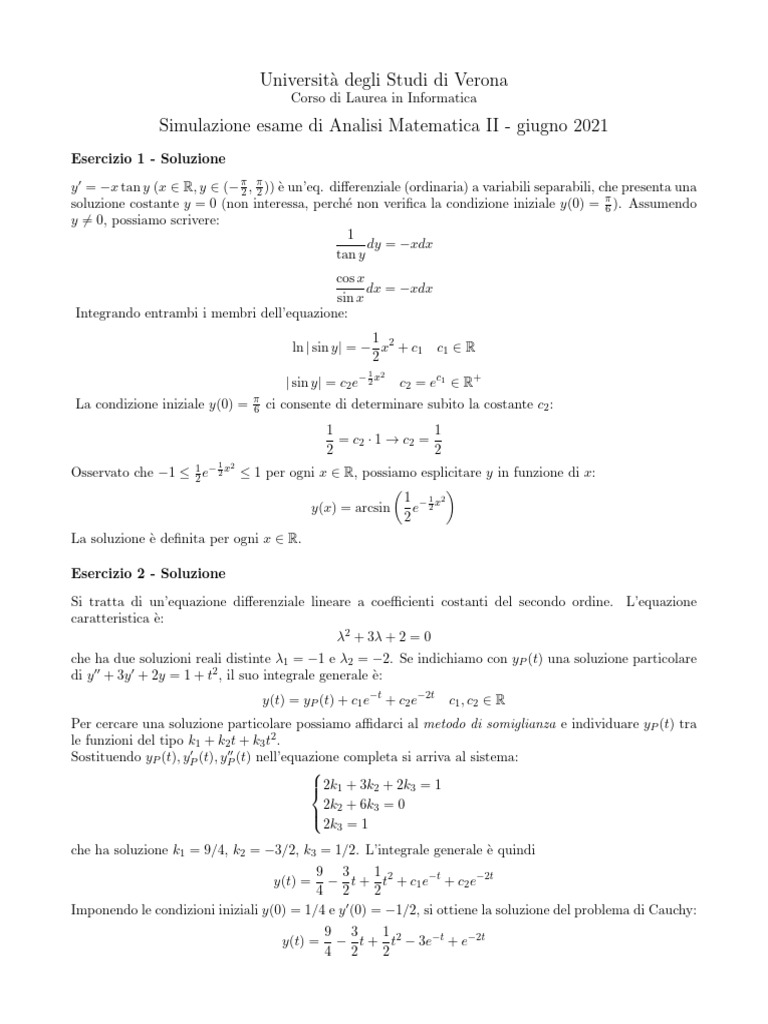 Simulazione esame di Analisi Matematica II - giugno 2021