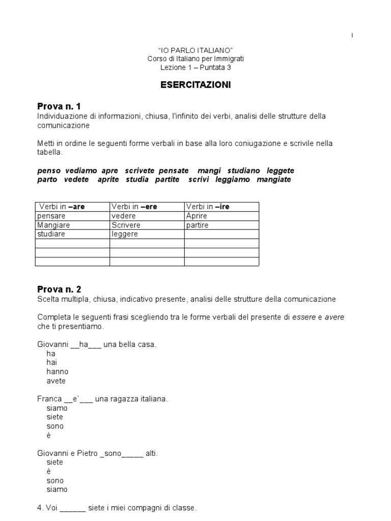 Scelta multipla, chiusa, indicativo presente, analisi delle strutture della comunicazione Completa le seguenti frasi scegliendo tra le forme verbali del presente di essere e avere che ti presentiamo. Giovanni __ha___ una bella casa. ha hai hanno avete Franca __e`___ una ragazza italiana. siamo siete sono Giovanni e Pietro _sono_____ alti. siete sono siamo 4. Voi ______ siete i miei compagni di classe.