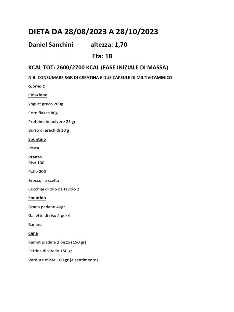 KCAL TOT: 2600/2700 KCAL (FASE INIZIALE DI MASSA)