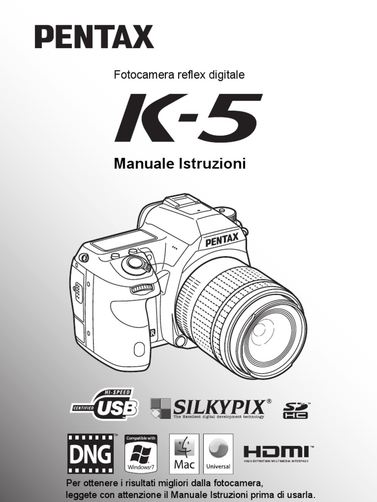 Vi ringraziamo per lacquisto di questa fotocamera digitale PENTAX X. Vi invitiamo a leggere con attenzione il presente manuale, e a conservarlo accuratamente: uno strumento prezioso che vi consentir una conoscenza approfondita delle molte funzioni e caratteristiche di questo apparecchio, e potr servirvi anche in seguito, per future consultazioni. Obiettivi utilizzabili In generale, gli obiettivi utilizzabili con questa fotocamera sono quelli delle serie DA, DA L, D FA e FA J e gli obiettivi dotati della posizione s (Auto) sulla ghiera dei diaframmi. Per usare qualsiasi altro obiettivo o accessorio, consultate p.66 e p.353. Informazioni sul diritto dautore Le immagini scattate con la X per scopi diversi da un utilizzo personale, non sono utilizzabili se non nel rispetto delle vigenti normative sul diritto dautore. Anche nel caso di un uso personale possono sussistere delle limitazioni, ad esempio per quanto concerne riprese eseguite nel corso di manifestazioni, spettacoli, o esibizione di prodotti. Tenete inoltre presente che le immagini eseguite a scopo commerciale non possono essere impiegate se non nellambito degli scopi per i quali ne sono stati sanciti i diritti e nel rispetto della normativa sul diritto dautore. Informazioni sui marchi di fabbrica PENTAX, X e smc PENTAX sono marchi di fabbrica di HOYA CORPORATION. PENTAX Digital Camera Utility e SDM sono marchi di fabbrica di HOYA CORPORATION. Microsoft e Windows sono marchi di fabbrica registrati di Microsoft Corporation negli Stati Uniti ed in altre nazioni. Windows Vista un marchio di fabbrica registrato o un marchio di fabbrica di Microsoft Corporation negli Stati Uniti ed in altre nazioni. Macintosh e Mac OS sono marchi di fabbrica di Apple Inc., registrati negli Stati Uniti e in altre nazioni. Il logo SDHC un marchio di fabbrica di SD-3C, LLC. Questo prodotto impiega tecnologia DNG su licenza di Adobe Systems Incorporated. Il logo DNG un marchio di fabbrica registrato o un marchio di fabbrica di Adobe Systems Incorporated negli Stati Uniti e in altre nazioni. HDMI, il logo HDMI e High-Definition Multimedia Interface sono marchi di fabbrica o marchi di fabbrica registrati di HDMI Licensing LLC. Tutti gli altri marchi o denominazioni dei prodotti sono marchi di fabbrica o marchi di fabbrica registrati delle rispettive aziende. Tuttavia, i riferimenti TM o non sono riportati in tutti i casi in questo manuale. Questo prodotto supporta PRINT Image Matching III. Le fotocamere digitali, le stampanti e il software con supporto PRINT Image Matching consentono ai fotografi di ottenere immagini pi fedeli ai propri obiettivi. Alcune funzioni non sono disponibili su stampanti che non sono conformi allo standard PRINT Image Matching III. Copyright 2001 Seiko Epson Corporation. Tutti i diritti sono riservati. PRINT Image Matching un marchio di fabbrica della Seiko Epson Corporation. Il logo PRINT Image Matching un marchio di fabbrica della Seiko Epson Corporation.