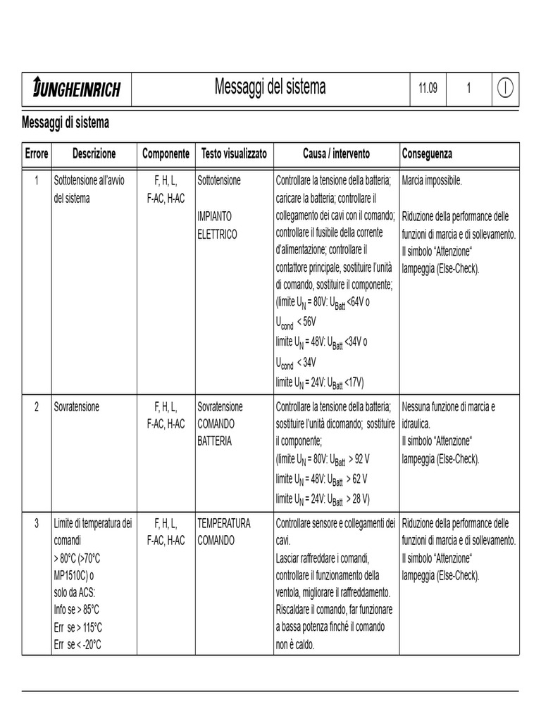 1 Sottotensione all’avvio F, H, L, Sottotensione Controllare la tensione della batteria; Marcia impossibile.