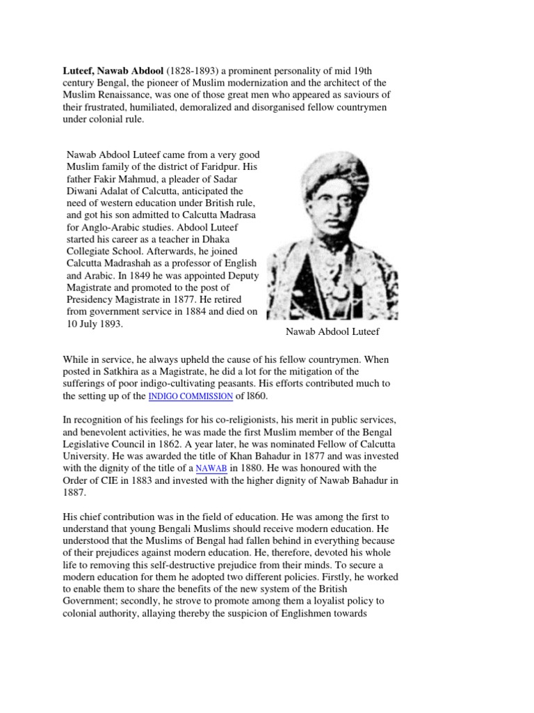 Muslims. He believed that educated Muslims would understand the intention, power and skill of the Government and thus develop a sense of loyalty to the colonial power. To achieve this goal, he avoided any conflict with the ruling authority. Through Maulana KARAMAT ALI JAUNPURI, he had it declared that India under the British rule was not a Dar ul-Harb and thereby tried to settle the main political debate of Muslims in the 19th century. He announced a prize for the best essay written on 'How far would the inculcation of European sciences benefit the Mahomedan students in the present circumstances of India and what are the most practical means of imparting such instruction'. This was done in order to arouse awareness about modern education among the Muslims of Bengal. His next important step was the establishment of the MOHAMMEDAN LITERARY SOCIETY (Mahomedan Literary Society) in Calcutta in 1863 in order to formulate public opinion in favour of modern education and modern scholarship, and to bring enlightened Muslims, Hindus, and Englishmen in close intercourse for mutual benefits. Though the Society was not a political organisation, it presented before the Government the demands and aspirations of the Muslims. Abdool Luteef's efforts to start an Anglo-Persian Department in the Calcutta Madrasah and to also teach its students Bengali and Urdu were remarkable. His undaunted efforts convinced the Government of the need of higher education for Muslims. As a result, HINDU COLLEGE was turned into PRESIDENCY COLLEGE and made open for all in 1854. Among his other contributions towards Muslim education were 'A Minute on the Hooghly Mudrussah' and 'A Paper on Mahomedan Education in Bengal'. The latter, was in effect, a report on the Hughli Madrasah. On its basis, the Anglo-Persian Department was opened and scholarships for its students announced. Through the Mohammedan Literary Society, he advanced the cause of Muslim education. At the same time he took an active part in contemporary Muslims politics. Through his efforts the Mohsin Endowment Fund was set apart for Muslims. Though not a progressive, he could be called a liberal conservative. Nawab Abdool Luteef was a self-made man and owed his position in life to his own exertions. From a Madrasah teacher he rose to be a leader of his people and one of the prominent public men of the day. As a mark of respect to him, a marble bust of Nawab Abdool Luteef was unveiled at the Senate House of Calcutta University in 1915. [MA Khaleque]
