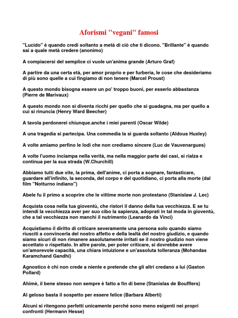 "Lucido" quando credi soltanto a met di ci che ti dicono. "Brillante" quando sai a quale met credere (anonimo) A compiacersi del semplice ci vuole un'anima grande (Arturo Graf) A partire da una certa et, per amor proprio e per furberia, le cose che desideriamo di pi sono quelle a cui fingiamo di non tenere (Marcel Proust) A questo mondo bisogna essere un po' troppo buoni, per esserlo abbastanza (Pierre de Marivaux) A questo mondo non si diventa ricchi per quello che si guadagna, ma per quello a cui si rinuncia (Henry Ward Beecher) A tavola perdonerei [Link] i miei parenti (Oscar Wilde) A una tragedia si partecipa. Una commedia la si guarda soltanto (Aldous Huxley) A volte amiamo perfino le lodi che non crediamo sincere (Luc de Vauvenargues) A volte l'uomo inciampa nella verit, ma nella maggior parte dei casi, si rialza e continua per la sua strada ([Link]) Abbiamo tutti due vite, la prima, dell'anime, ci porta a sognare, fantasticare, guardare all'infinito, la seconda, del corpo e del quotidiano, ci porta alla morte (dal film "Notturno indiano") Abele fu il primo a scoprire che le vittime morte non protestano (Stanislaw J. Lec) Acquista cosa nella tua giovent, che ristori il danno della tua vecchiezza. E se tu intendi la vecchiezza aver per suo cibo la sapienza, adoprati in tal moda in giovent, che a tal vecchiezza non manchi il nutrimento (Leanardo da Vinci) Acquistiamo il diritto di criticare severamente una persona solo quando siamo riusciti a convincerla del nostro affetto e della lealt del nostro giudizio, e quando siamo sicuri di non rimanere assolutamente irritati se il nostro giudizio non viene accettato o rispettato. In altre parole, per poter criticare, si dovrebbe avere un'amorevole capacit, una chiara intuizione e un'assoluta tolleranza (Mohandas Karamchand Gandhi) Agnostico chi non crede a niente e pretende che gli altri credano a lui (Gaston Pollard) Ahim, il bene stesso non sempre fatto a fin di bene (Stanislas de Boufflers) Al geloso basta il sospetto per essere felice (Barbara Alberti) Alcuni si ritengono perfetti unicamente perch sono meno esigenti nei propri confronti (Hermann Hesse)