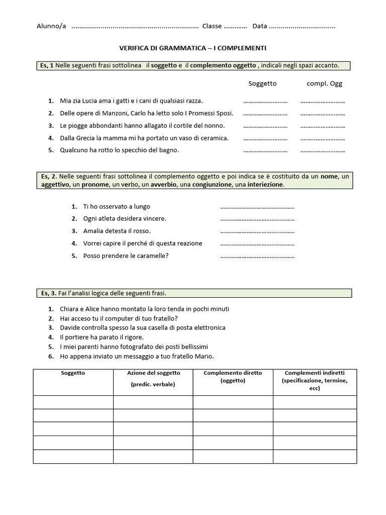 VERIFICA DI GRAMMATICA – I COMPLEMENTI