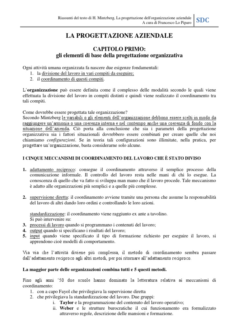Riassunti del testo di H. Mintzberg, La progettazione dell'organizzazione aziendale A cura di Francesco Lo Piparo