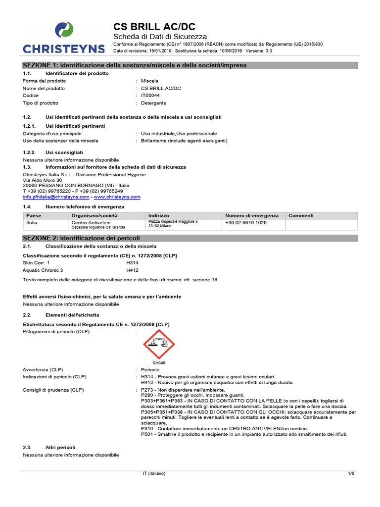 Data di revisione: 15/01/2019 Sostituisce la scheda: 10/06/2016 Versione: 3.0