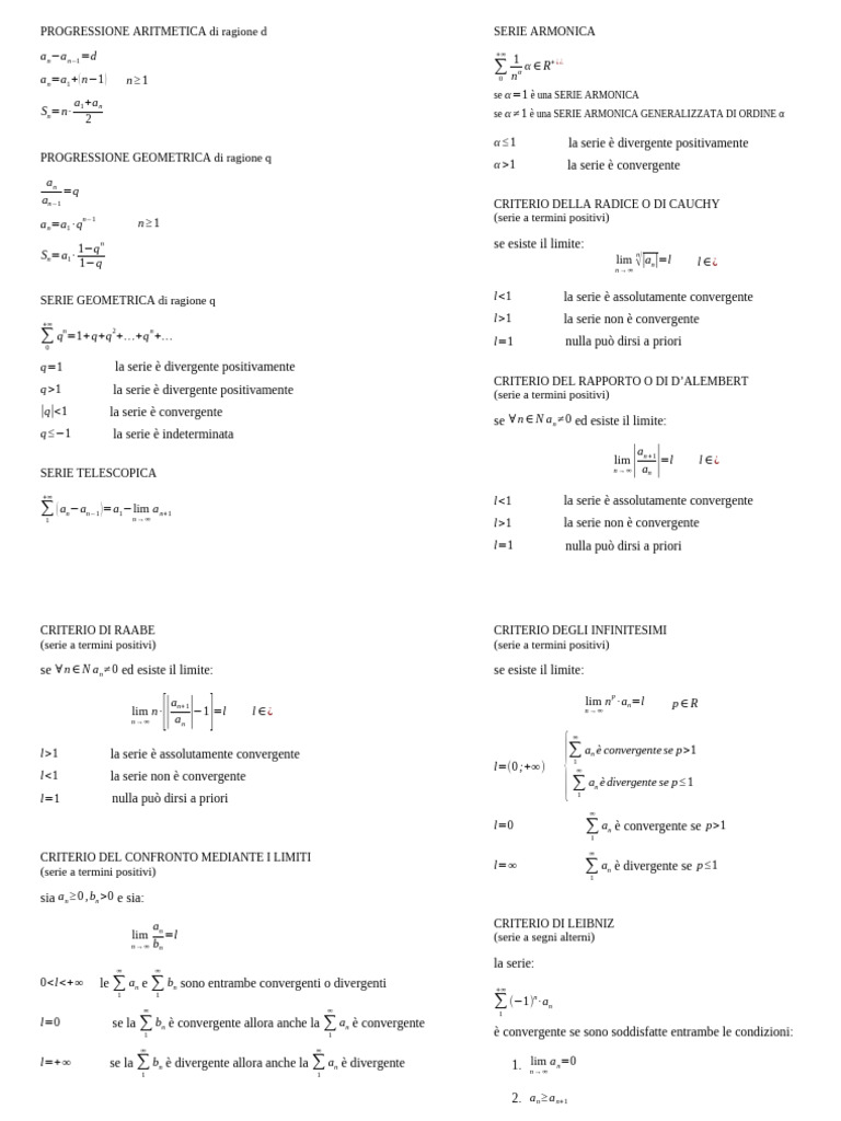 PROGRESSIONE ARITMETICA di ragione d SERIE ARMONICA
