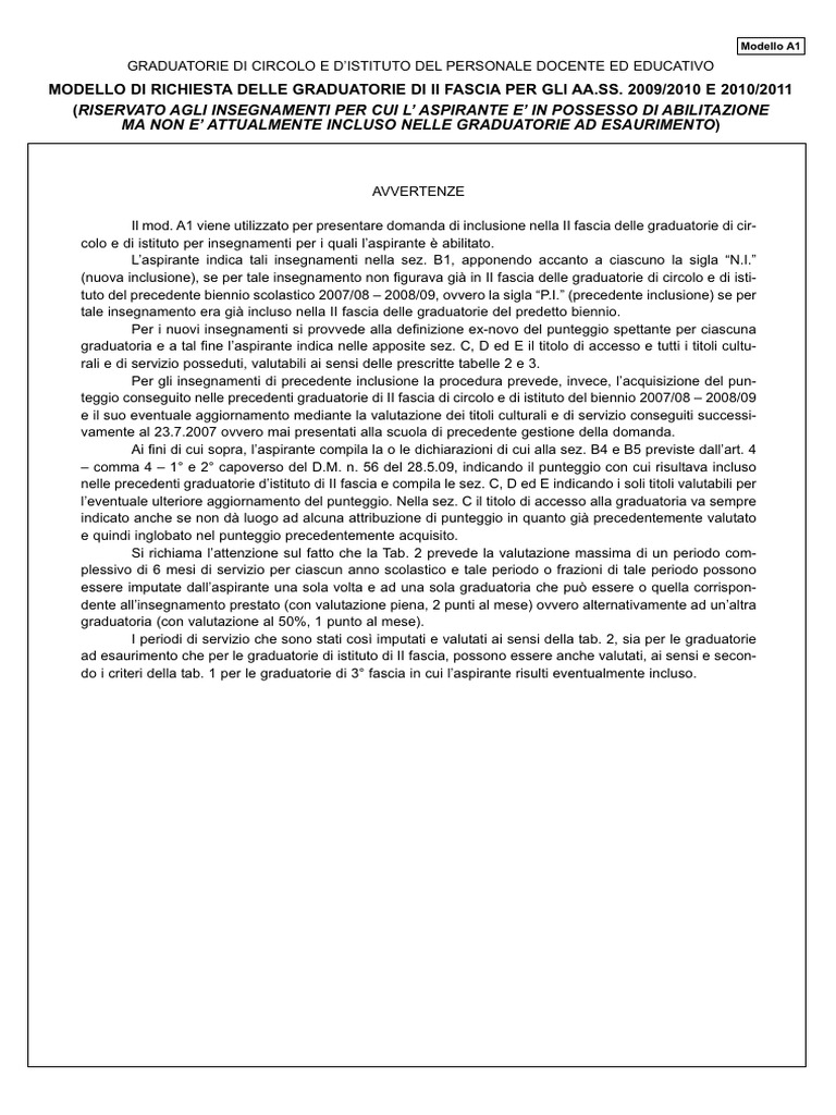 Il mod. A1 viene utilizzato per presentare domanda di inclusione nella II fascia delle graduatorie di cir-