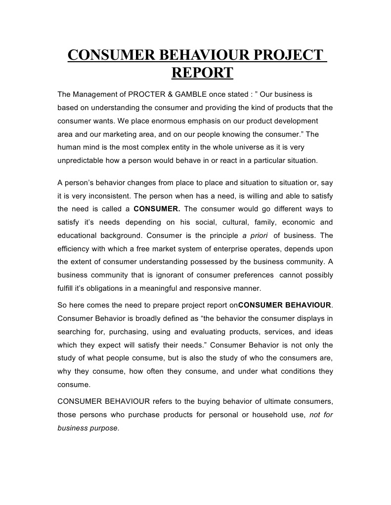 The Management of PROCTER & GAMBLE once stated : Our business is based on understanding the consumer and providing the kind of products that the consumer wants. We place enormous emphasis on our product development area and our marketing area, and on our people knowing the consumer. The human mind is the most complex entity in the whole universe as it is very unpredictable how a person would behave in or react in a particular situation. A persons behavior changes from place to place and situation to situation or, say it is very inconsistent. The person when has a need, is willing and able to satisfy the need is called a CONSUMER. The consumer would go different ways to satisfy its needs depending on his social, cultural, family, economic and educational background. Consumer is the principle a priori of business. The efficiency with which a free market system of enterprise operates, depends upon the extent of consumer understanding possessed by the business community. A business community that is ignorant of consumer preferences cannot possibly fulfill its obligations in a meaningful and responsive manner. So here comes the need to prepare project report onCONSUMER BEHAVIOUR. Consumer Behavior is broadly defined as the behavior the consumer displays in searching for, purchasing, using and evaluating products, services, and ideas which they expect will satisfy their needs. Consumer Behavior is not only the study of what people consume, but is also the study of who the consumers are, why they consume, how often they consume, and under what conditions they consume. CONSUMER BEHAVIOUR refers to the buying behavior of ultimate consumers, those persons who purchase products for personal or household use, not for business purpose.