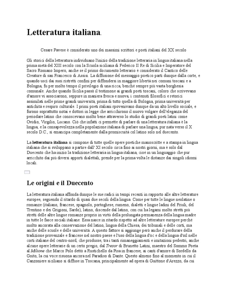 Cesare Pavese considerato uno dei massimi scrittori e poeti italiani del XX secolo Gli storici della letteratura individuano l'inizio della tradizione letteraria in lingua italiana nella prima met del XIII secolo con la Scuola siciliana di Federico II Re di Sicilia e Imperatore del Sacro Romano Impero, anche se il primo documento letterario considerato il Cantico delle Creature di san Francesco di Assisi. La diffusione del messaggio poetico part dunque dalla corte, e quando usc dai suoi ristretti confini per diffondersi in maggiore libert nei comuni toscani e a Bologna, fu per molto tempo il privilegio di una ricca, bench sempre pi vasta borghesia comunale. Anche quando Sicilia pass il testimone ai grandi poeti toscani, coloro che scrivevano d'amore vi associarono, seppure in maniera fresca e nuova, i contenuti filosofici e retorici assimilati nelle prime grandi universit, prima di tutto quella di Bologna, prima universit per antichit e respiro culturale. I primi poeti italiani rpovenivano dunque da un alto livello sociale, e furono soprattutto notai e dottori in legge che arricchirono il nuovo volgare dell'eleganza del periodare latino che conoscevano molto bene attraverso lo studio di grandi poeti latini come Ovidio, Virgilio, Lucano. Ci che infatti ci permette di parlare di una letteratura italiana la lingua, e la consapevolezza nella popolazione italiana di parlare una lingua, pur nata verso il X secolo D.C., si emancipa completamente dalla promiscuit col latino solo nel duecento. La letteratura italiana si compone di tutte quelle opere poetiche manoscritte e a stampa in lingua italiana che si sviluppano a partire dall' XI secolo circa fino ai nostri giorni, ma solo dal Duecento che ha inizio la tradizione letteraria in lingua italiana, cio in un linguaggio che pur arricchito dai pi diversi apporti dialettali, prende per la prima volta le distanze dai singoli idiomi locali.