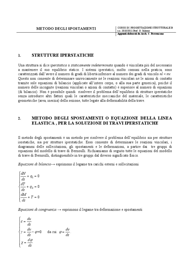 Il metodo degli spostamenti un metodo per risolvere il problema dellequilibrio sia per strutture isostatiche, sia per strutture iperstatiche. Esso consente di determinare le reazioni vincolari, i diagrammi delle sollecitazioni, gli spostamenti e le deformazioni, a partire dai tre gruppi di equazioni del modello di trave di Bernoulli. Richiamiamo di seguito tutte le equazioni del modello di trave di Bernoulli, distinguendole in tre gruppi dal diverso significato fisico. Equazioni di bilancio esprimono il legame tra carichi esterni e sollecitazioni