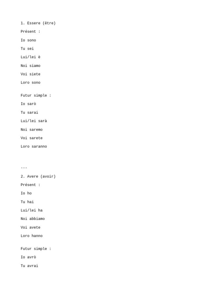 Il documento presenta la coniugazione di dieci verbi fondamentali in italiano, sia al presente che al futuro semplice. I verbi trattati includono 'essere', 'avere', 'andare', 'fare', 'venire', 'dire', 'stare', 'potere', 'volere' e 'dovere'. Ogni verbo è accompagnato dalle forme coniugate per tutte le persone singolari e plurali.