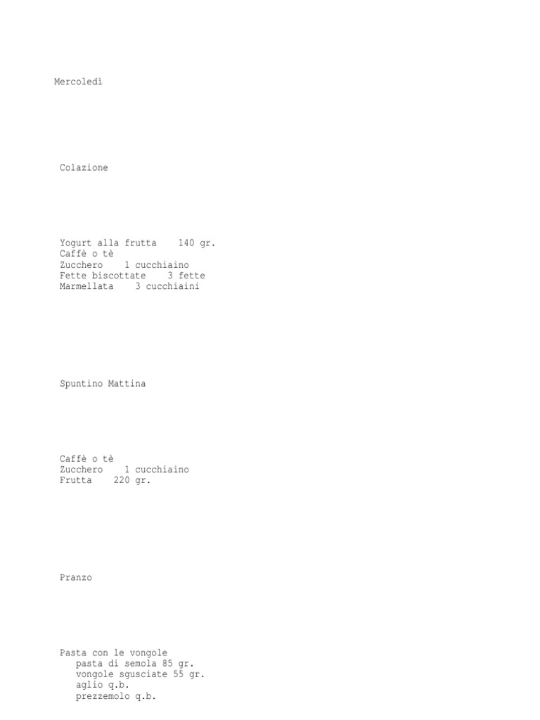 Minestra di verdure senza pasta verdure miste 220 gr. fagioli freschi o in scatola 33 gr. patate 110 gr. olio d'oliva 1/2 cucchiaio parmigiano 1 cucchiaino Uovo sodo 1 uovo Insalata di lattuga lattuga 110 gr. olio d'oliva 1/2 cucchiaio Pane integrale 75 gr.