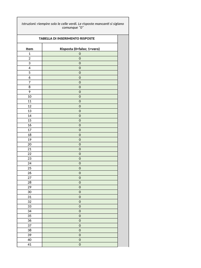 Item Risposta (0=falso; 1=vero)