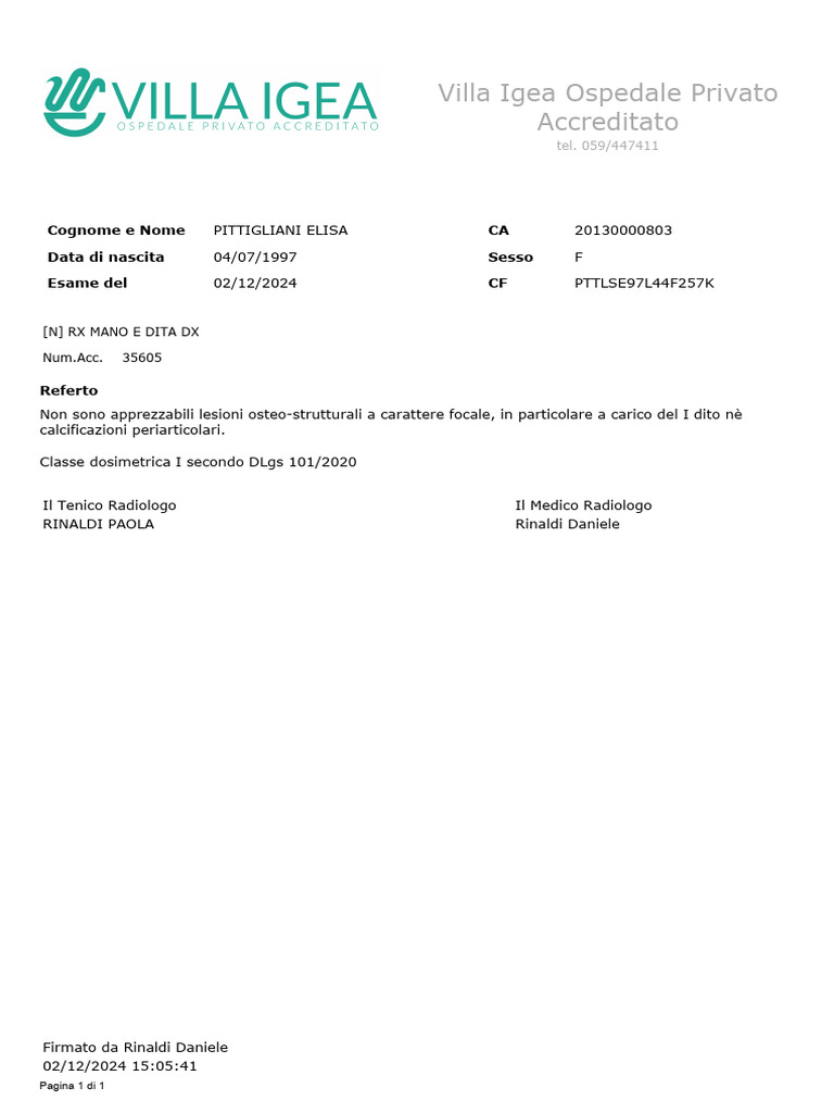 Non sono apprezzabili lesioni osteo-strutturali a carattere focale, in particolare a carico del I dito nè