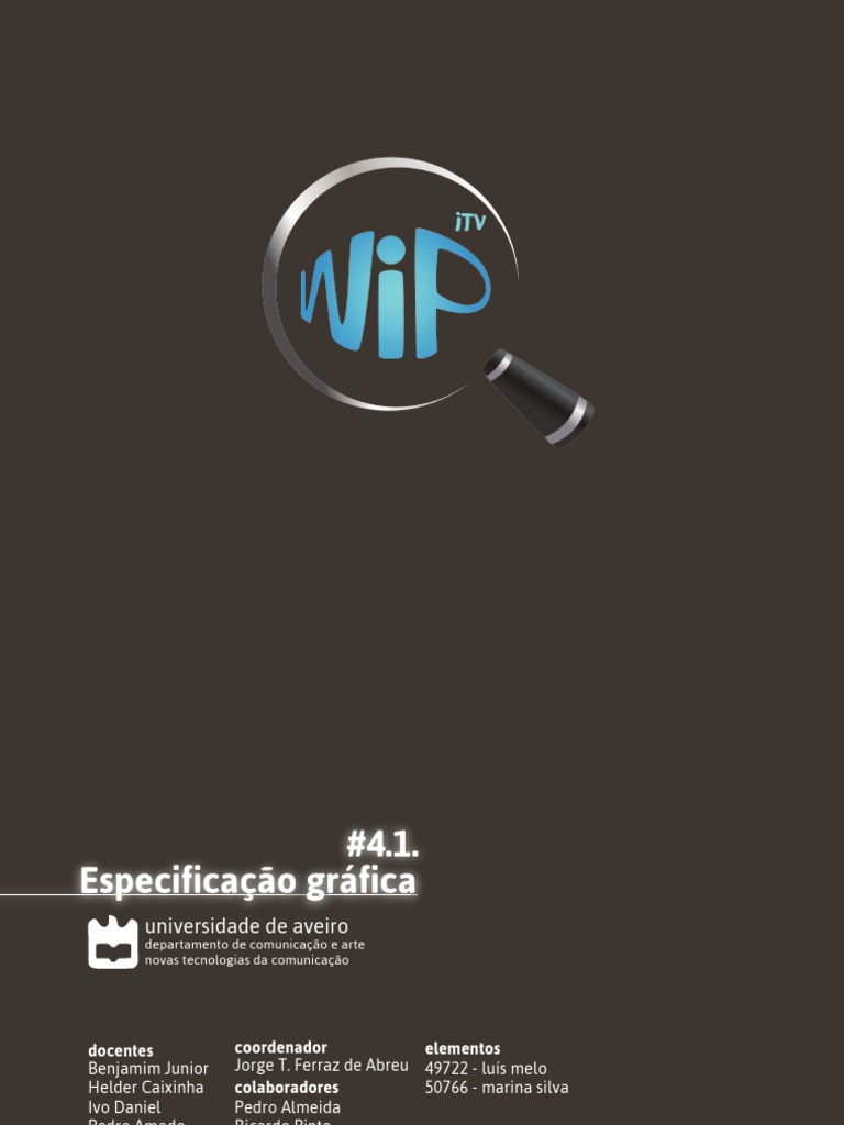 Aps o desenvolvimento desta etapa concluiu-se principalmente qual a posio visual que pretendemos transmitir com a marca WiP iTV. Neste sentido, orientmo-nos por uma linha grfica minimalista e lmpida, sem acrescentar elementos desnecessrios ao utilizador. O facto de a plataforma deste projecto ser uma televiso tambm limitou o processo criativo, pelo que existem regras a serem cumpridas, como por exemplo o sistema cromtico e o tipo de letra. No entanto, tentmos contornar esta barreira, tirando o maior potencial da nossa criatividade com as ferramentas disponveis.