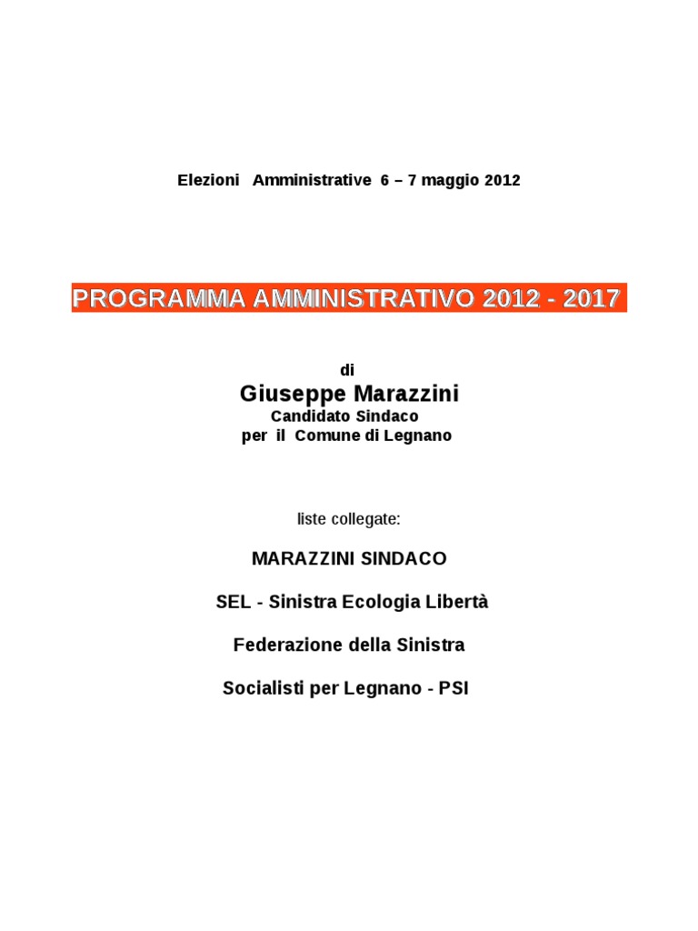 di sviluppo economico e di contenimento dei costi di alcuni alimenti fondamentali per la nostra esistenza. La questione del cibo, dei suoi costi e del suo reperimento, fra non molto diventer una problematica prioritaria anche per lItalia. impellente lesigenza di uscire dal tunnel dellimmobilismo in cui Legnano precipitata. A mio parere luscita la si pu trovare solo guardando a Milano, perch lunica citt che pu giocare un ruolo europeo. Legnano e Milano devono trovare il modo di lavorare in sinergia, ad esempio con accordi bilaterali, non devono essere antagoniste perch altrimenti in una logica di indifferenza, Legnano rischia di rimanere al palo. Il futuro non si presenta roseo; i provvedimenti presi dal governo Monti cominciano a farsi sentire(tolta la virgola) e pesantemente; basti osservare landamento dei costi del carburante, sempre in crescita, e la perdita dei posti di lavoro. Oltre a ci pesa anche lo stato confusionale in cui si trovano i partiti presenti in parlamento, a prescindere da chi sostiene Monti e chi no. Confusione che si ripercuote anche a livello locale, Lega e PdL, dopo anni di compartecipazione alla gestione del potere cittadino e delle aziende compartecipate, si dividono, gli uni dicendo degli altri cercate solo poltrone. Mentre i cittadini stanno pagando gli errori di questi partiti il tasso della criminalit istituzionale non accenna a diminuire, basti vedere il numero degli inquisiti con incarichi istituzionali dalla Lombardia alla Sicilia Non bisogna cedere allo sconforto, reagire a tutto questo si pu. Io con la mia lista arancione e con quelle collegate rappresento una alternativa valida a un sistema di potere politico locale disinteressato a salvaguardare il bene comune dei cittadini. Cari concittadine e concittadini, il momento della riscossa, non disertate le urne.