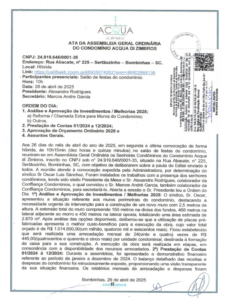 L'assemblea generale ordinaria del Condominio Acqua di Zimbros si è tenuta il 26 aprile 2025, con l'obiettivo di discutere investimenti e miglioramenti per il 2025, la prestazione di conti e l'approvazione del bilancio ordinario. È stata approvata una ristrutturazione urgente dei muri del condominio con un costo di R$ 1.014.600,00, finanziata attraverso un contributo mensile per unità. Inoltre, è stato deciso di non aumentare la tassa condominiale per il 2025 e sono state discusse varie migliorie per le aree comuni.