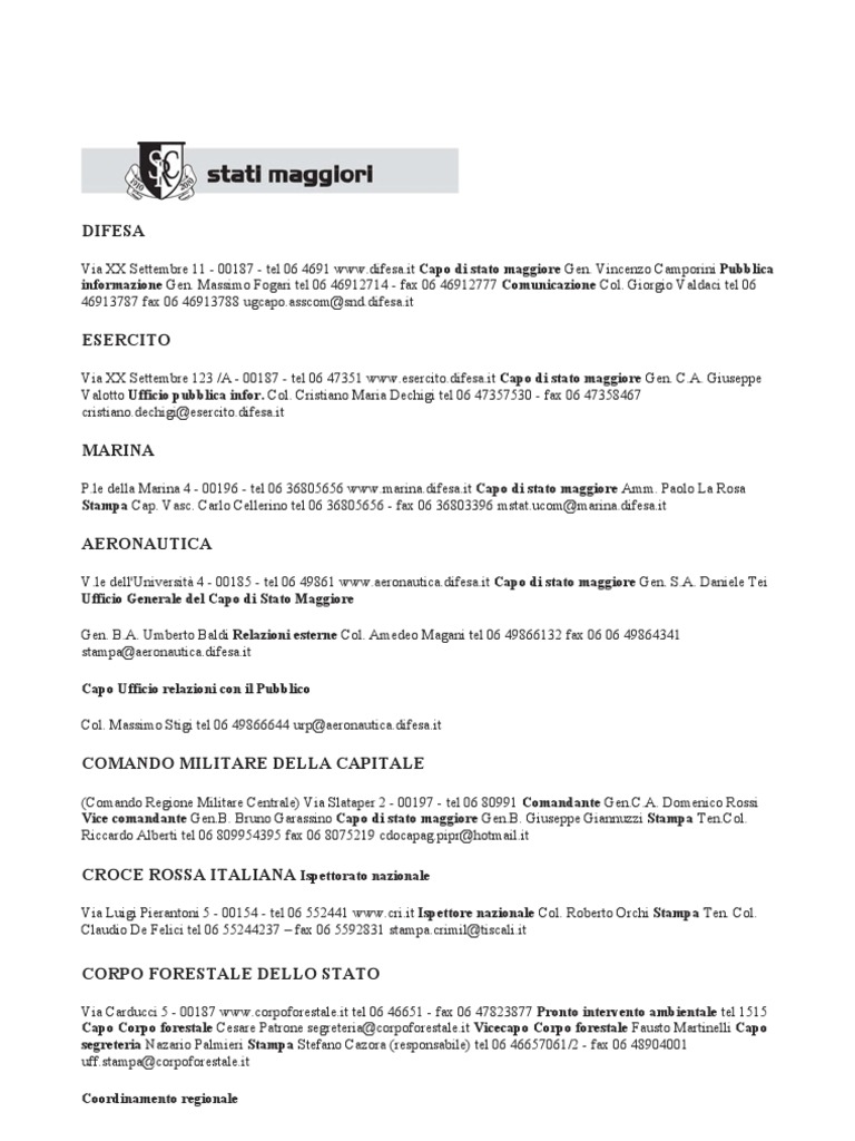 Via XX Settembre 123 /A - 00187 - tel 06 47351 [Link] Capo di stato maggiore Gen. C.A. Giuseppe Valotto Ufficio pubblica infor. Col. Cristiano Maria Dechigi tel 06 47357530 - fax 06 47358467 [Link]@[Link]