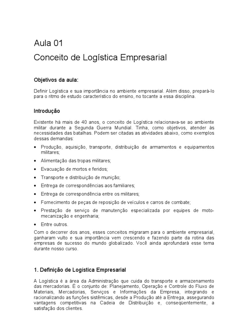 Existente h mais de 40 anos, o conceito de Logstica relacionava-se ao ambiente militar durante a Segunda Guerra Mundial. Tinha, como objetivos, atender s necessidades das batalhas. Podem ser citadas as atividades abaixo, como exemplos dessas demandas: Produo, aquisio, transporte, distribuio de armamentos e equipamentos militares; Alimentao das tropas militares; Evacuao de mortos e feridos; Transporte e distribuio de munio; Entrega de correspondncias aos familiares; Entrega de correspondncia entre os militares; Fornecimento de peas de reposio de veculos e carros de combate; Prestao de servio de manuteno especializada por equipes de motomecanizao e engenharia; Entre outros.