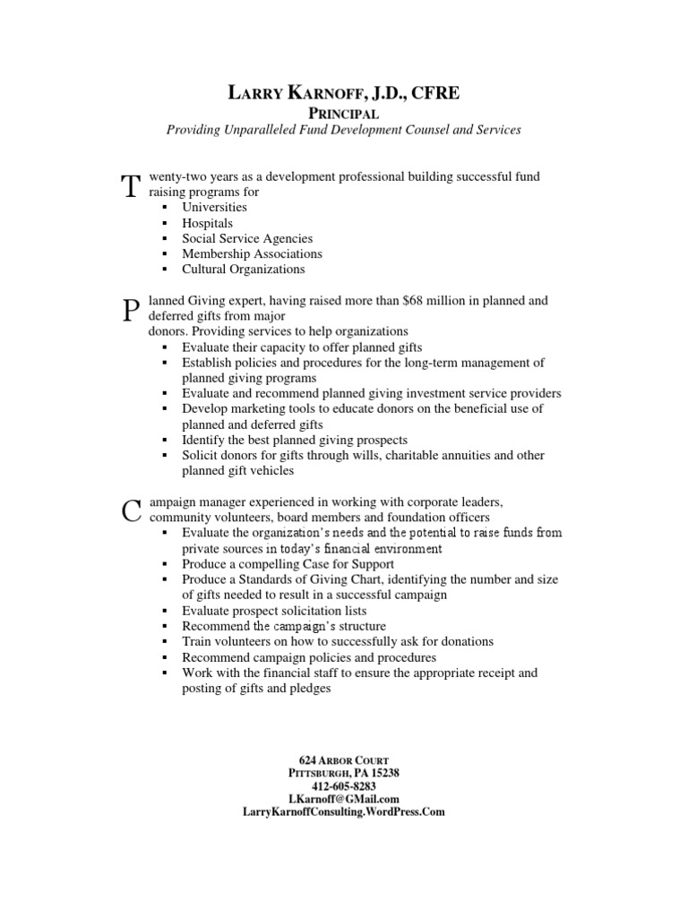 areer Achievements Outstanding Fund Raising Executive, 2008 Association of Fundraising Professionals, Western Pennsylvania Director of Development Capital Campaign Manager Carnegie Library of Pittsburgh Directed the completion of the Librarys $55 million capital campaign Exceeded 2007 Annual Fund goal of $450,000 by $500,000 Director of Planned Giving, Southeast Region American Friends of The Hebrew University Created the organizations regional planned giving program Cultivated relationships with high net-worth individuals and families throughout southern Florida Raised $2.5 million in outright gifts, pledges and bequest intentions Director of Development Allegheny General Hospital Designed and initiated a $15 million capital campaign Directed the implementation of a major donor challenge grant campaign of $1 million Trained and supported the development professionals of the West Penn Allegheny Health System in planned giving solicitations Director of Planned Giving University of Pittsburgh Designed and implemented the planned giving component of the Universitys $500 million capital campaign, raising more than $64 million in outright, planned and deferred gifts in six years Developed the planned giving policies and procedures for the capital campaign Closed gifts in all aspects of planned giving including life estates (real estate), charitable lead trusts, charitable remainder trusts, charitable gift annuities, life insurance gifts, gifts of securities and bequests Provided technical and professional advice on planned giving to all staff including the Chancellor and Vice Chancellor for Development Produced and presented planned giving seminars in various markets, designed and implemented a multi-faceted planned giving marketing program to targeted audiences and created technical and non-technical marketing pieces