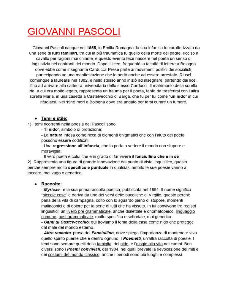 - Altre raccolte: prosa del Fanciullino, dove spiega l’importanza di mantenere vivo
