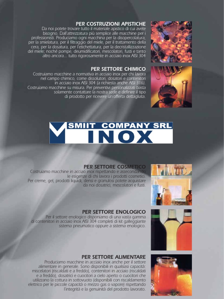 Da noi potete trovare tutto il materiale apistico di cui avete bisogno. Dallattrezzatura pi semplice alle macchine per i professionisti. Produciamo ogni macchina per la disopercolatura, per la smielatura, per il filtraggio del miele, per il trattamento della cera, per la dosatura, per letichettatura, per la decristallizzazione del miele; noch pompe, deumidificatori, mescolatori, fusti e tanto altro ancora... tutto rigorosamente in acciaio inox AISI 304