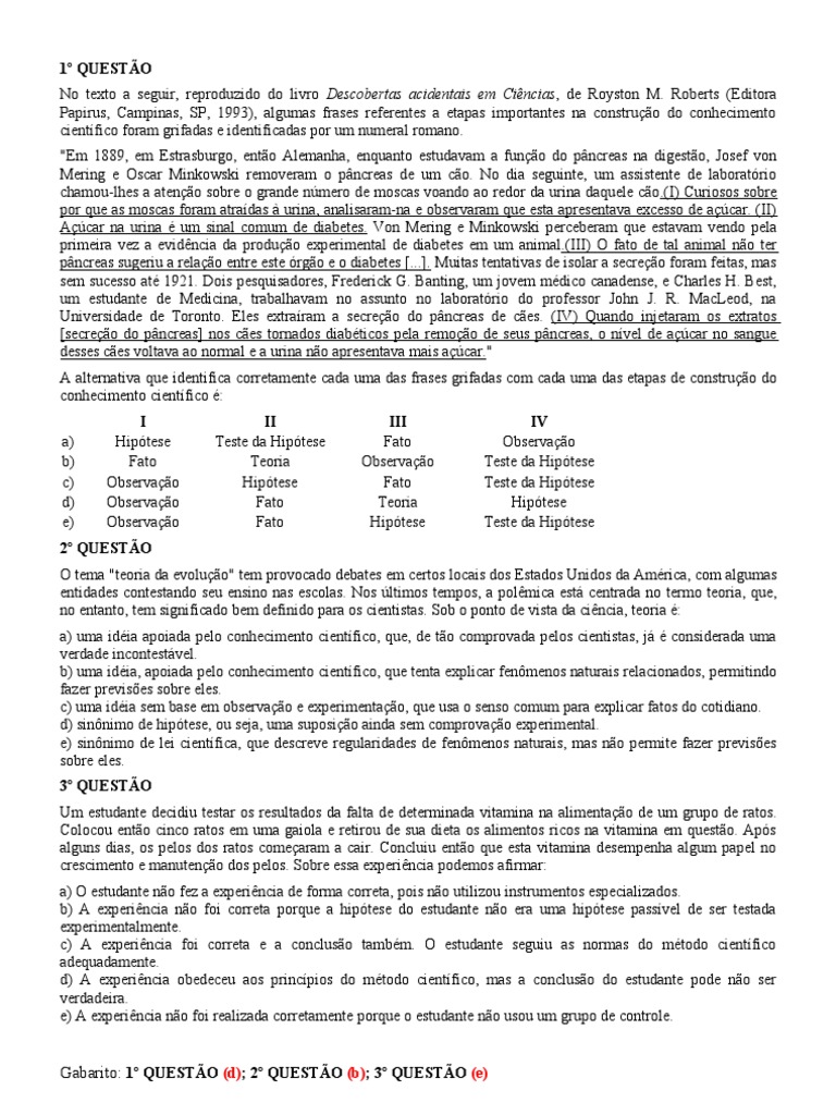 Roberts (Editora Papirus, Campinas, SP, 1993), algumas frases referentes a etapas importantes na construo do conhecimento cientfico foram grifadas e identificadas por um numeral romano. "Em 1889, em Estrasburgo, ento Alemanha, enquanto estudavam a funo do pncreas na digesto, Josef von Mering e Oscar Minkowski removeram o pncreas de um co. No dia seguinte, um assistente de laboratrio chamou-lhes a ateno sobre o grande nmero de moscas voando ao redor da urina daquele co.(I) Curiosos sobre por que as moscas foram atradas urina, analisaram-na e observaram que esta apresentava excesso de acar. (II) Acar na urina um sinal comum de diabetes. Von Mering e Minkowski perceberam que estavam vendo pela primeira vez a evidncia da produo experimental de diabetes em um animal.(III) O fato de tal animal no ter pncreas sugeriu a relao entre este rgo e o diabetes [...]. Muitas tentativas de isolar a secreo foram feitas, mas sem sucesso at 1921. Dois pesquisadores, Frederick G. Banting, um jovem mdico canadense, e Charles H. Best, um estudante de Medicina, trabalhavam no assunto no laboratrio do professor John J. R. MacLeod, na Universidade de Toronto. Eles extraram a secreo do pncreas de ces. (IV) Quando injetaram os extratos [secreo do pncreas] nos ces tornados diabticos pela remoo de seus pncreas, o nvel de acar no sangue desses ces voltava ao normal e a urina no apresentava mais acar." A alternativa que identifica corretamente cada uma das frases grifadas com cada uma das etapas de construo do conhecimento cientfico : a) b) c) d) e) I Hiptese Fato Observao Observao Observao II Teste da Hiptese Teoria Hiptese Fato Fato III Fato Observao Fato Teoria Hiptese IV Observao Teste da Hiptese Teste da Hiptese Hiptese Teste da Hiptese