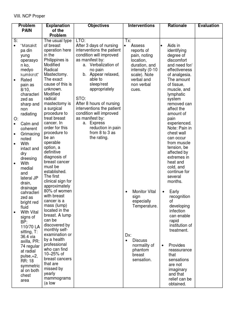 NCP Proper Explanation of the Problem S: The usual type of breast Masakit operation here pa din in the yung operasyo Philippines is Modified n ko, Radical medyo kumikirot Mastectomy. The exact Rated cause of this is pain as unknown. 8/10, characteri Modified radical zed as sharp and mastectomy is a surgical non procedure to radiating treat breast O: Calm and cancer. In order for this coherent Grimacing procedure to be an noted operable With intact and option, a definitive dry diagnosis of dreesing breast cancer With must be medial established. and lateral JP The first clinical sign for drain, approximately drainage cahracteri 80% of women with breast zed as bright red cancer is a mass (lump) fluid With Vital located in the breast. A lump signs of can be BP: 110/70 LA discovered by sitting, T: monthly selfexamination or 36.4 via axilla, PR: by a health 74 regular professional who can find at radial pulse,+2, 1025% of breast cancers RR: 18 symmetric that are al on both missed by yearly chest mammograms area (a low Problem PAIN Objectives Interventions Rationale Evaluation