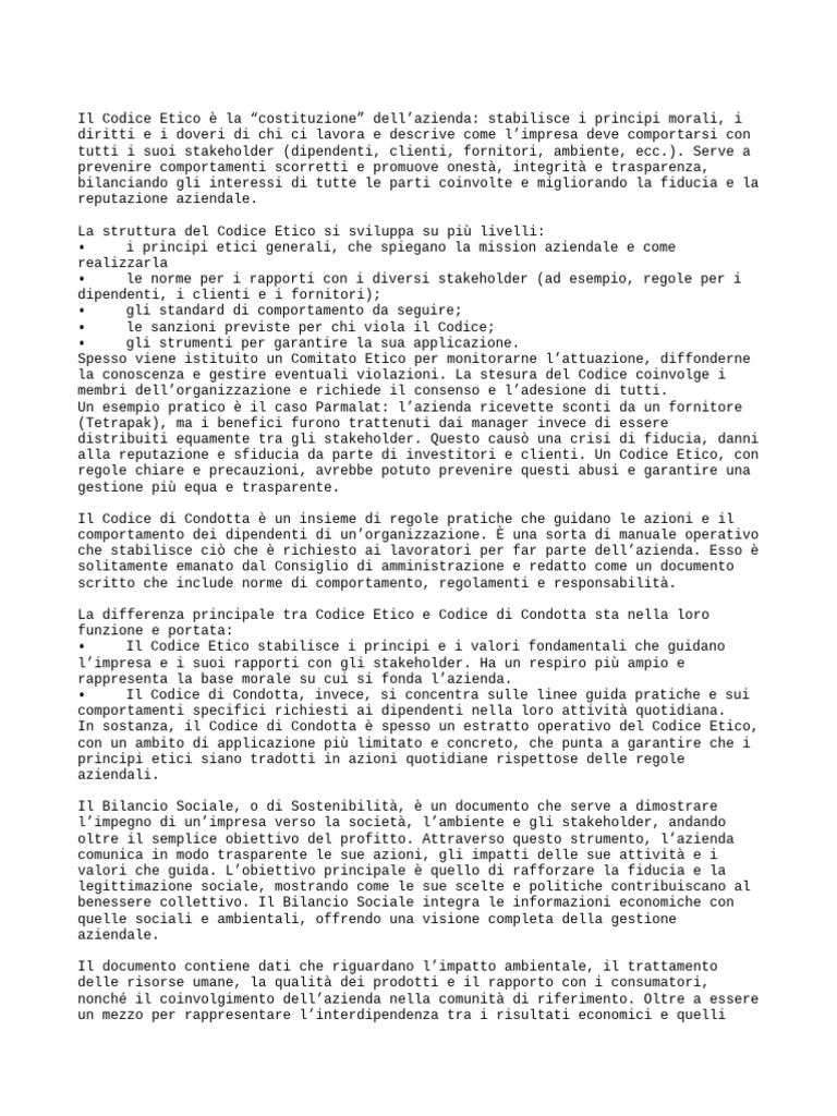 alla reputazione e sfiducia da parte di investitori e clienti. Un Codice Etico, con