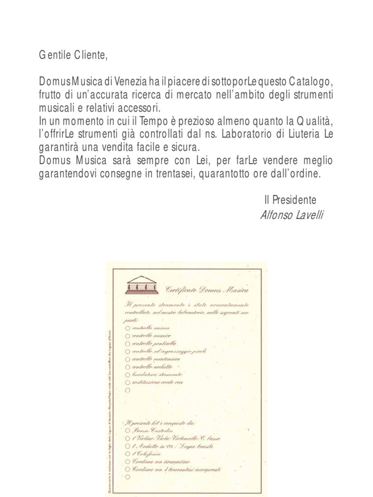 strumenti musicali e relativi accessori. In un momento in cui il Tempo prezioso almeno quanto la Qualit, loffrirLe strumenti gi controllati dal ns. Laboratorio di Liuteria Le garantir una vendita facile e sicura. Domus Musica sar sempre con Lei, per farLe vendere meglio garantendovi consegne in trentasei, quarantotto ore dallordine. Il Presidente Alfonso Lavelli