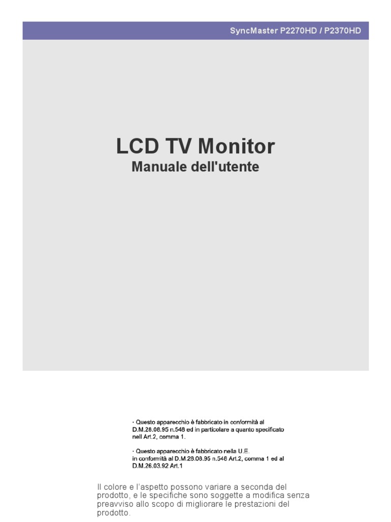 Riguardo alle immagini residue La visualizzazione di un'immagine fissa per un lungo periodo di tempo pu generare un'immagine residua o una macchia chiara sullo schermo. In caso di inutilizzo prolungato del prodotto, impostare la modalit di risparmio energetico o un salvaschermo. A causa delle limitazioni tecniche del costruttore del pannello LCD, le immagini generate da questo prodotto possono risultare pi luminose o pi scure del normale di circa 1ppm (parti per milione) di pixel. Il numero dei sotto pixel di un pannello LCD per dimensione: Numero di sotto pixel = Max. risoluzione orizzontale x Max. risoluzione verticale x 3