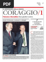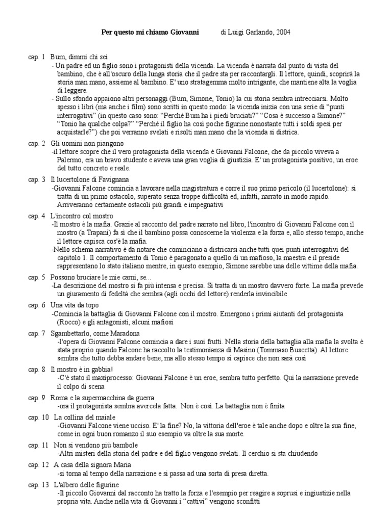 cap. 1 Bum, dimmi chi sei - Un padre ed un figlio sono i protagonisti della vicenda. La vicenda narrata dal punto di vista del bambino, che all'oscuro della lunga storia che il padre sta per raccontargli. Il lettore, quindi, scoprir la storia man mano, assieme al bambino. E' uno stratagemma molto intrigante, che mantiene alta la voglia di leggere. - Sullo sfondo appaiono altri personaggi (Bum, Simone, Tonio) la cui storia sembra intrecciarsi. Molto spesso i libri (ma anche i film) sono scritti in questo modo: la vicenda inizia con una serie di punti interrogativi (in questo caso sono: Perch Bum ha i piedi bruciati? Cosa successo a Simone? Tonio ha qualche colpa? Perch il figlio ha cos poche figurine nonostante tutti i soldi spesi per acquistarle?) che poi verranno svelati e risolti man mano che la vicenda si districa. cap. 2 Gli uomini non piangono -il lettore scopre che il vero protagonista della vicenda Giovanni Falcone, che da piccolo viveva a Palermo, era un bravo studente e aveva una gran voglia di giustizia. E' un protagonista positivo, un eroe del tutto concreto e reale. cap. 3 Il lucertolone di Favignana -Giovanni Falcone comincia a lavorare nella magistratura e corre il suo primo pericolo (il lucertolone): si tratta di un primo ostacolo, superato senza troppe difficolt ed, infatti, narrato in modo rapido. Arriveranno certamente ostacoli pi grandi e impegnativi cap. 4 L'incontro col mostro -Il mostro la mafia. Grazie al racconto del padre narrato nel libro, l'incontro di Giovanni Falcone con il mostro (a Trapani) fa s che il bambino possa conoscerne la violenza e la forza e, allo stesso tempo, anche il lettore capisca cos' la mafia. -Nello schema narrativo da notare che cominciano a districarsi anche tutti quei punti interrogativi del capitolo 1. Il comportamento di Tonio paragonato a quello di un mafioso, la maestra e il preside rappresentano lo stato italiano mentre, in questo esempio, Simone sarebbe una delle vittime della mafia. cap. 5 Possono bruciare le mie carni, se... -La descrizione del mostro si fa pi intensa e precisa. Si tratta di un mostro davvero forte. La mafia prevede un giuramento di fedelt che sembra (agli occhi del lettore) renderla invincibile cap. 6 Una vita da topo -Comincia la battaglia di Giovanni Falcone con il mostro. Emergono i primi aiutanti del protagonista (Rocco) e gli antagonisti, alcuni mafiosi cap. 7 Sgambettarlo, come Maradona -l'opera di Giovanni Falcone comincia a dare i suoi frutti. Nella storia della battaglia alla mafia la svolta stata proprio quando Falcone ha raccolto la testimonianza di Masino (Tommaso Buscetta). Al lettore sembra che tutto debba andare bene, ma allo stesso tempo si capisce che non sar cos cap. 8 Il mostro in gabbia! -C' stato il maxiprocesso: Giovanni Falcone un eroe, sembra tutto perfetto. Qui la narrazione prevede il colpo di scena cap. 9 Roma e la supermacchina da guerra -ora il protagonista sembra avercela fatta. Non cos. La battaglia non finita cap. 10 La collina del maiale -Giovanni Falcone viene ucciso. E' la fine? No, la vittoria dell'eroe tale anche dopo e oltre la sua fine, come in ogni buon romanzo il suo esempio va oltre la sua morte. cap. 11 Non si vendono pi bambole -Altri misteri della storia del padre e del figlio vengono svelati. Il cerchio si sta chiudendo cap. 12 A casa della signora Maria -si torna al tempo della narrazione e si passa ad una sorta di presa diretta. cap. 13 L'albero delle figurine -Il piccolo Giovanni dal racconto ha tratto la forza e l'esempio per reagire a soprusi e ingiustizie nella propria vita. Anche nella vita di Giovanni i cattivi vengono sconfitti