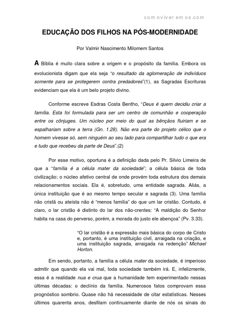 comoviveremos.com 5) BAUCHAM JR, Voddie. In A Supremacia de Cristo em um mundo psmoderno. Rio de Janeiro: CPAD, p. 53 6) Disponvel em http://veja.abril.com.br/081097/p_084.html 7) TIBA, Iami. Quem ama, educa!. So Paulo: Editora Gente, 2002, p. 180. Ibid 9) Ibid, p. 181 10) MACARTHUR JR., John, obra citada, p. 27. 11) Ibid, p. 29. 12) Disponvel no site